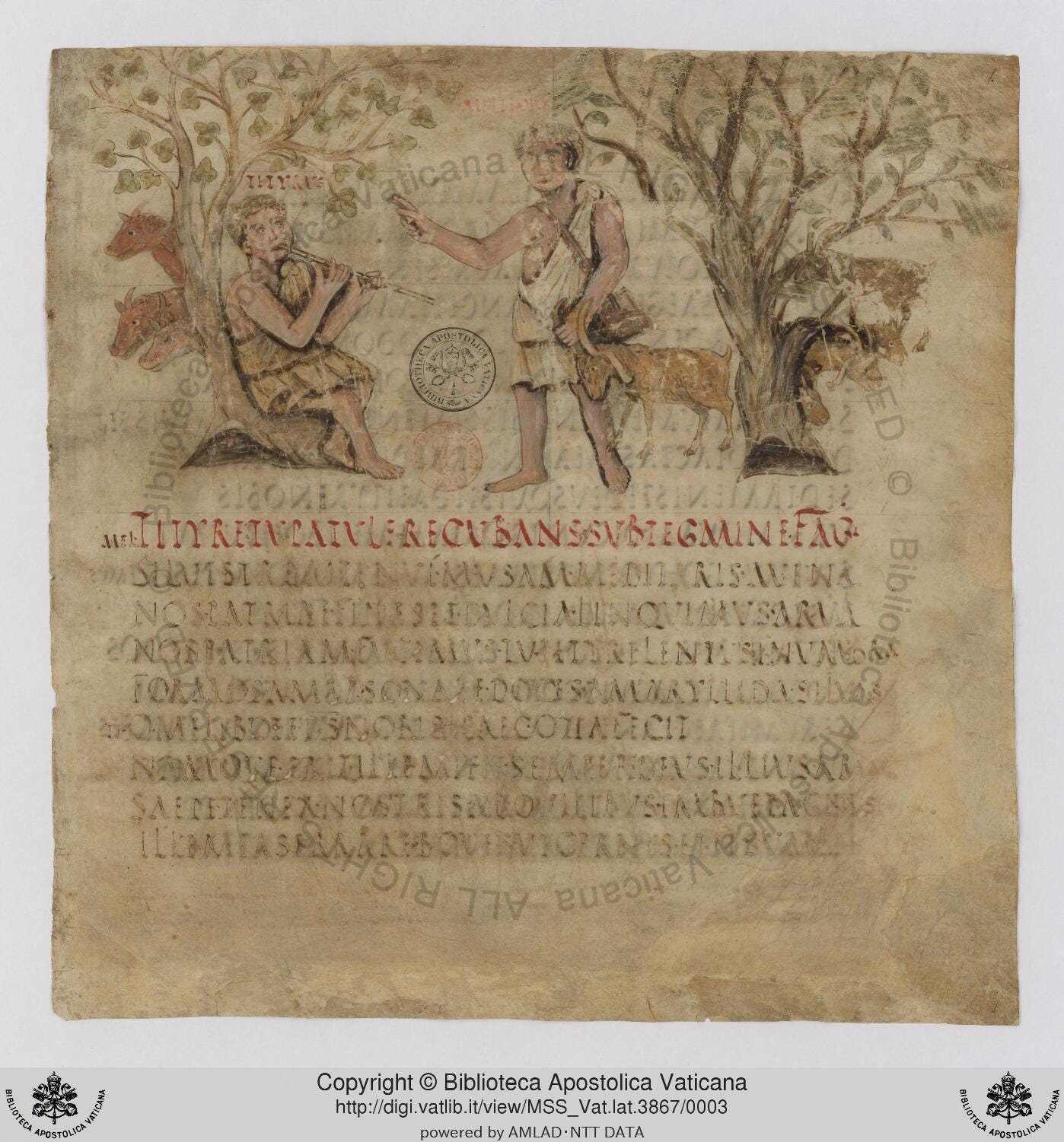 formosam resonare doces Amaryllida silvas. (Ecl. 1.1-5)Tityrus, lying there protected beneath the spreading beech-tree,